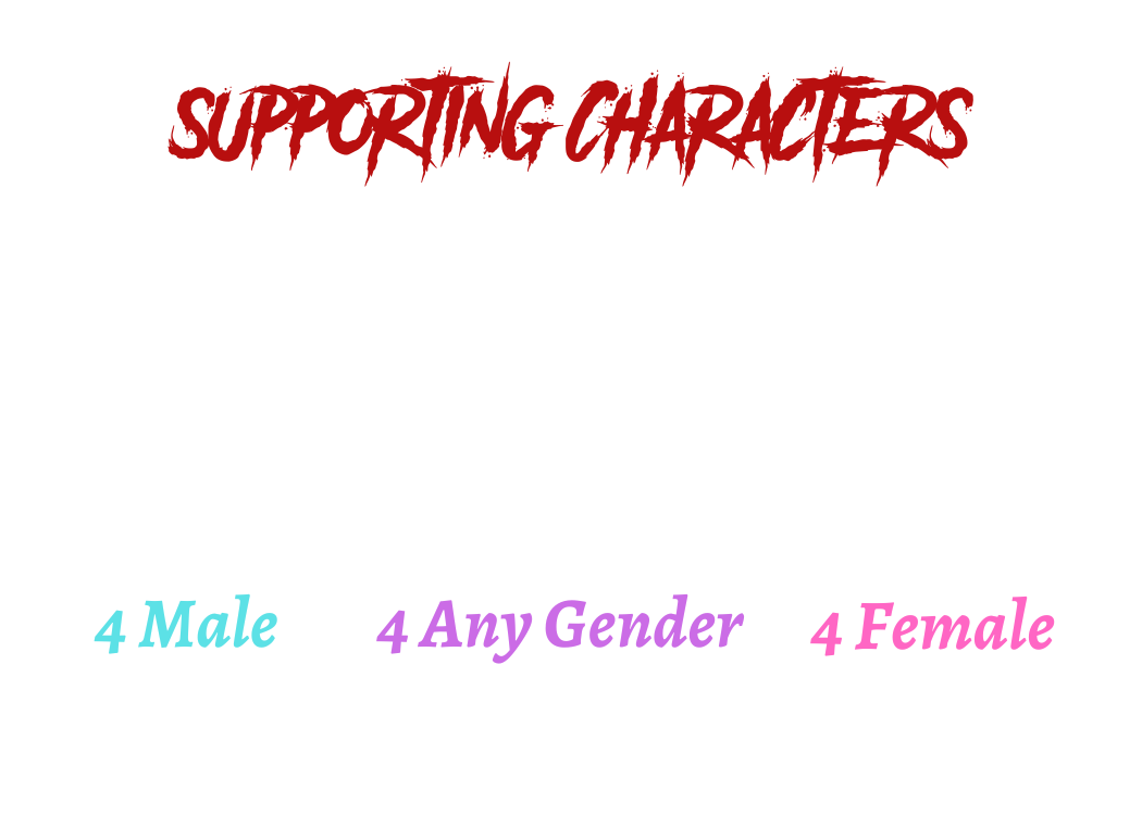 FEATURED CHARACTERS (EIGHT PEOPLE) These 8 characters have in depth backstory, motivation and relationships with the other featured characters. These featured characters are given a “FIELD GUIDE” which contains information that they share and keep private in each round of game play. Featured characters also come with a name tag and character description. There are three male, three female and two "any gender" featured characters to assign.